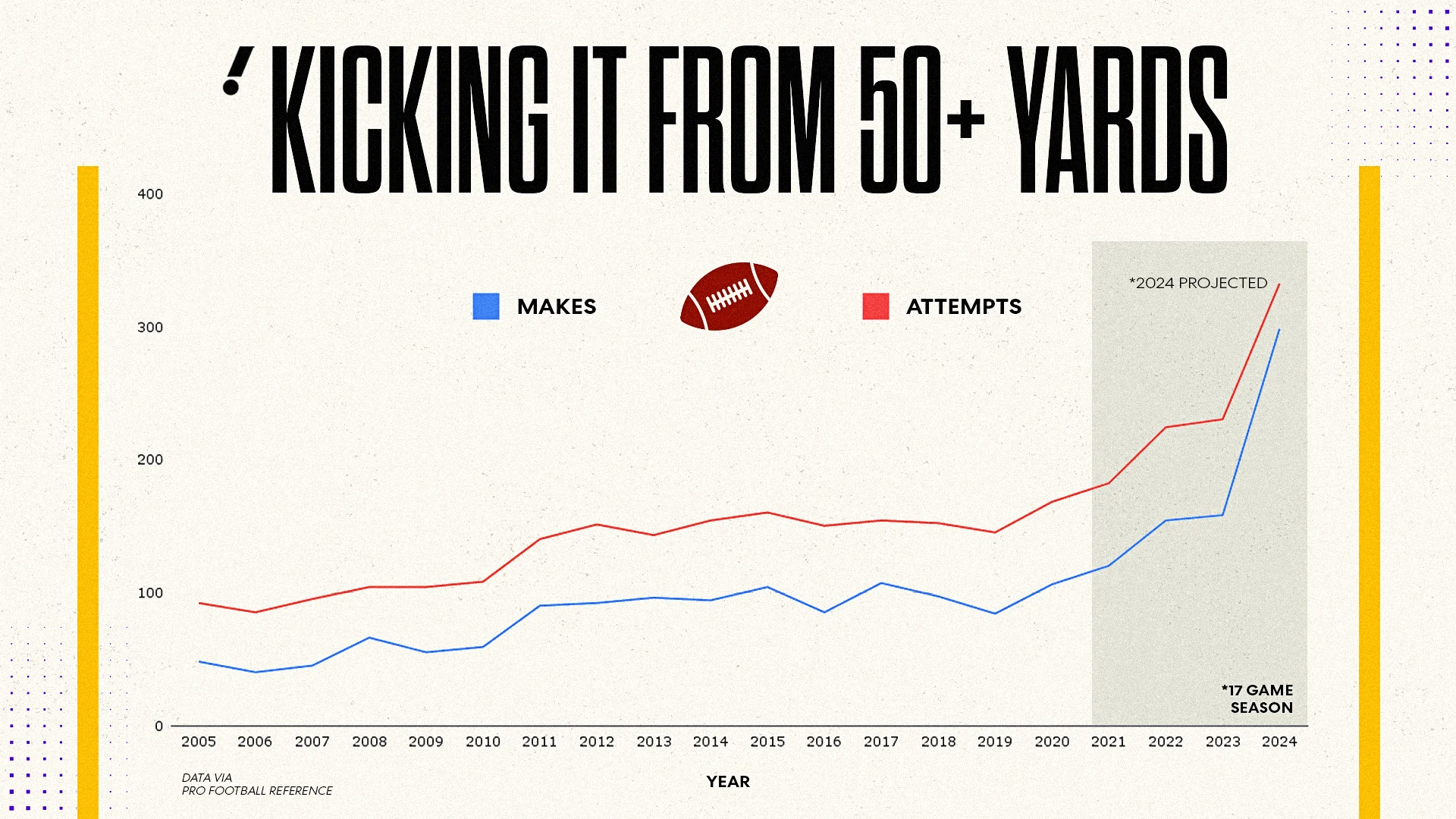 The biggest accuracy gains have come at long range. Kickers in 2024 were 40 percentage points more accurate on kicks of 55 to 59 yards than their counterparts in the early 2000s. This improvement has meaningfully changed game strategy.